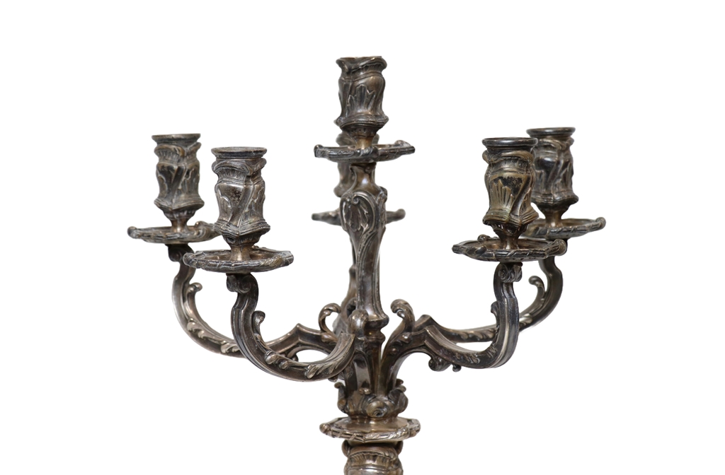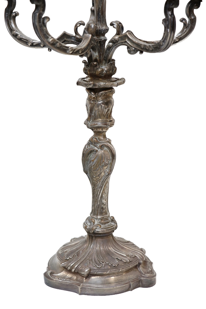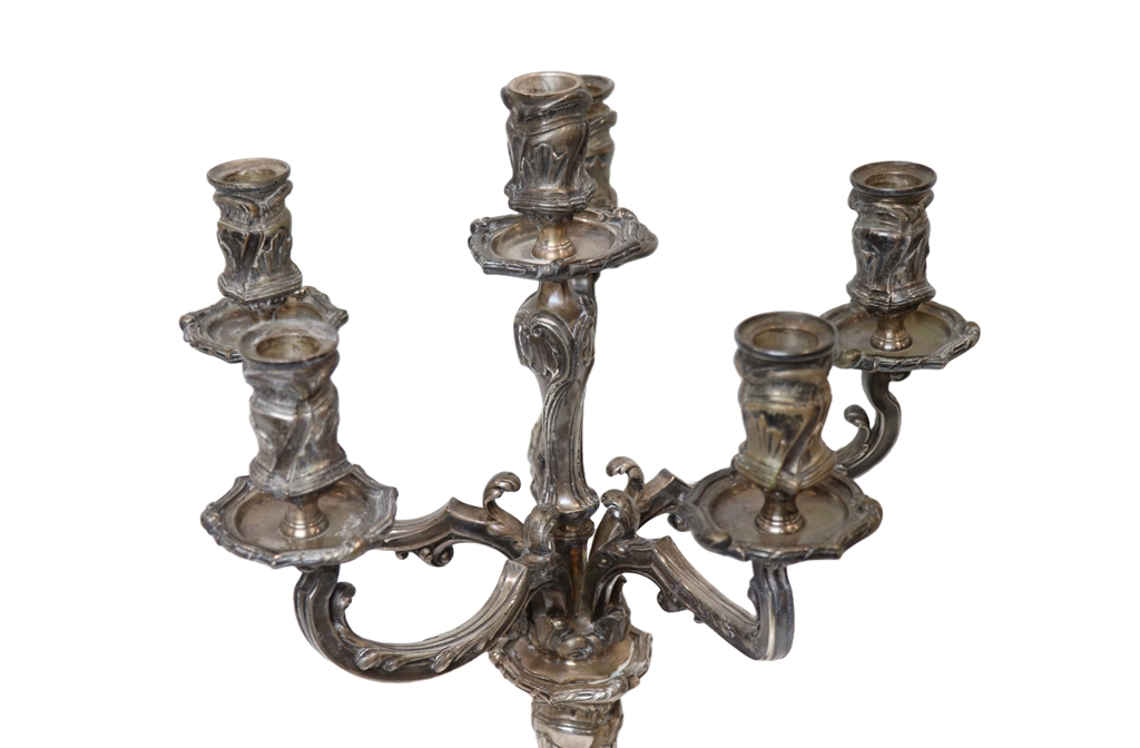 Paire de candélabres en métal argenté de style Louis XV à six lumières. Une bobèche manquante. Hauteur : 58 cm