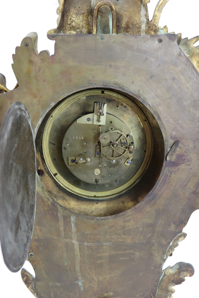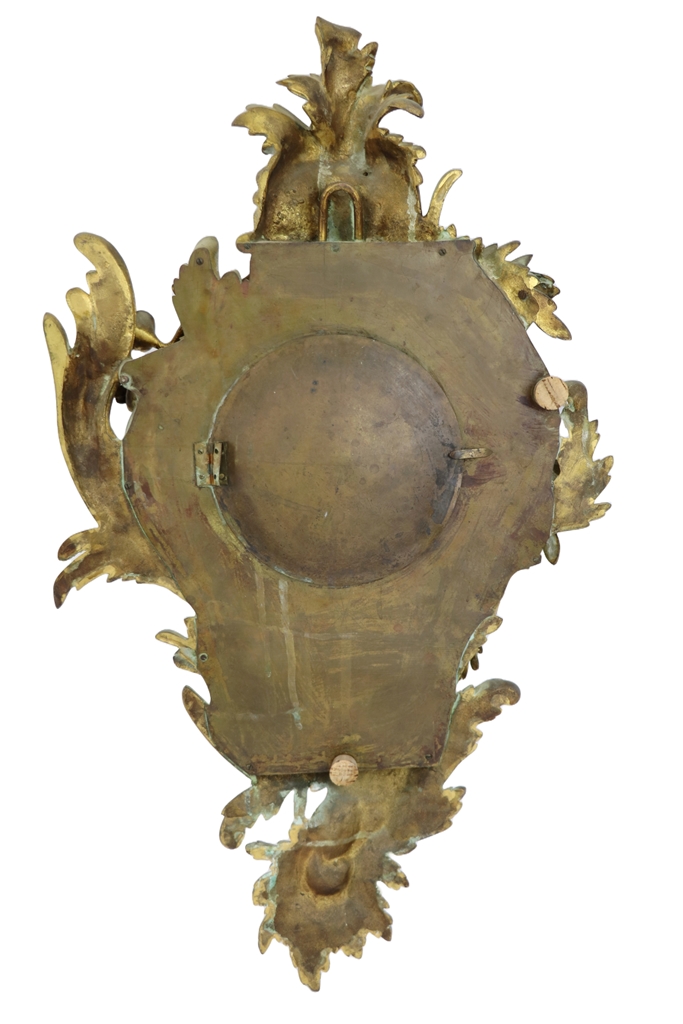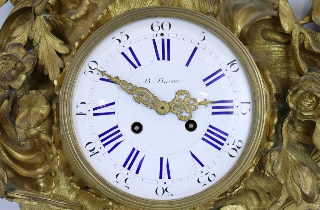 Cartel d'applique rocaille en bronze doré de style Louis XV à décor de fleurettes, volutes et feuillage. Cadran en émail blanc à chiffres romains pour les heures et chiffres arabes pour les minutes, signé JB Bardon. Mécanisme postérieur Vincenti. Dimensions : 73x42 cm