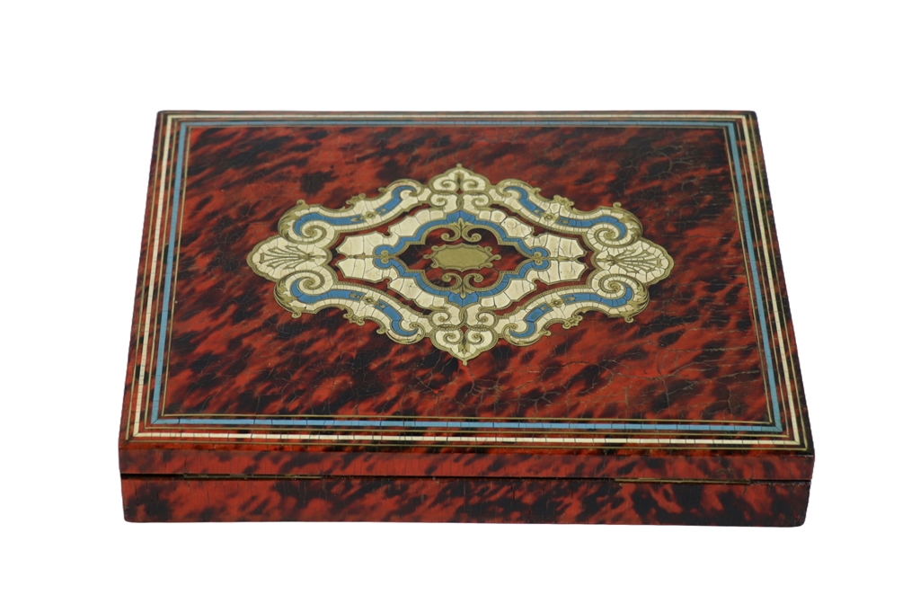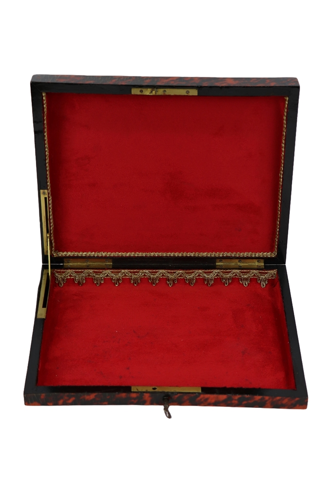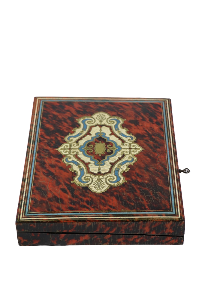 Coffret à jeu Napoléon III en placage d'écaille de tortue à décor d'un médaillon central en partie doré. Restauration d'usage. Serrure et charnière signées G. Fres Btes. Dimensions : 5x27,5x21,5 cm