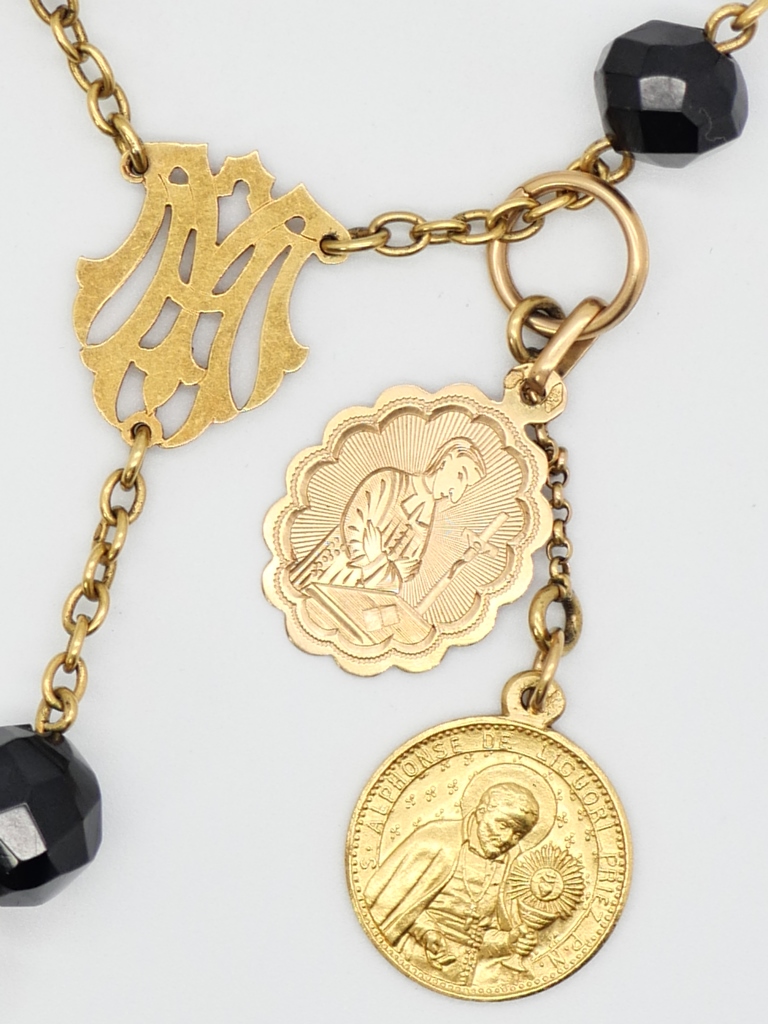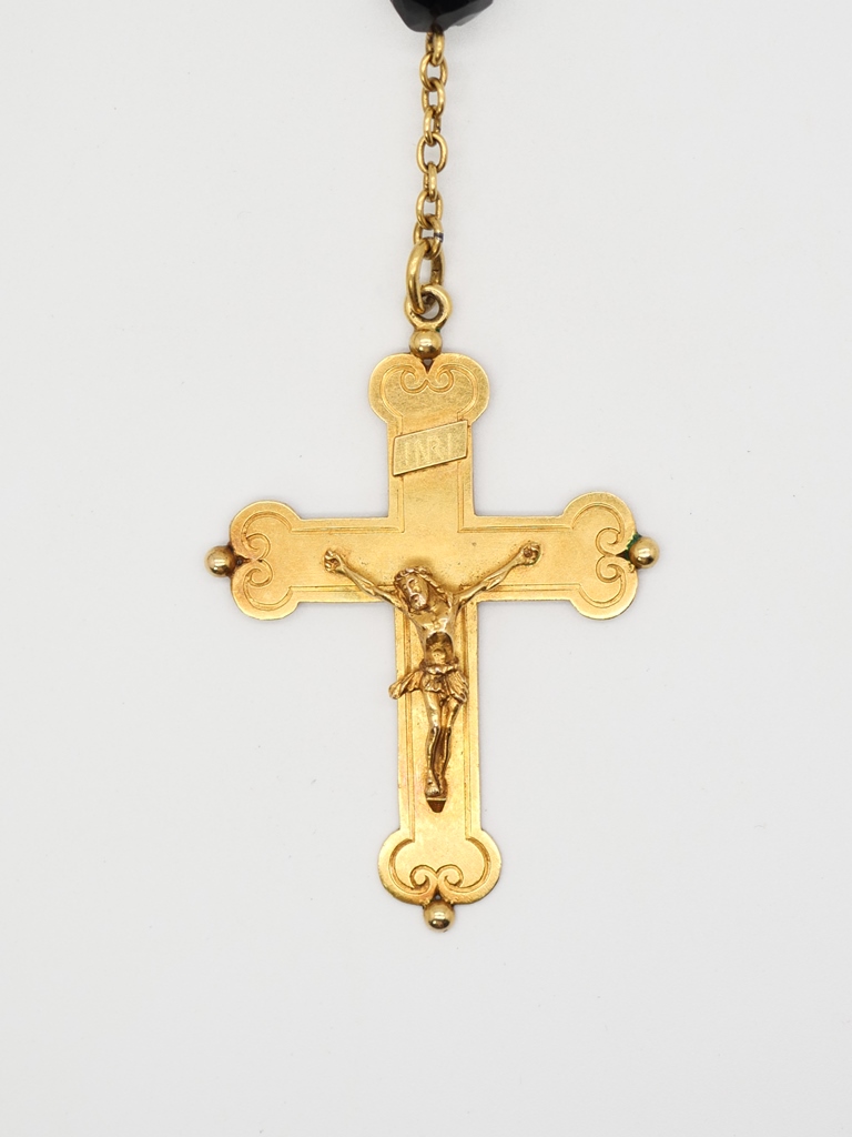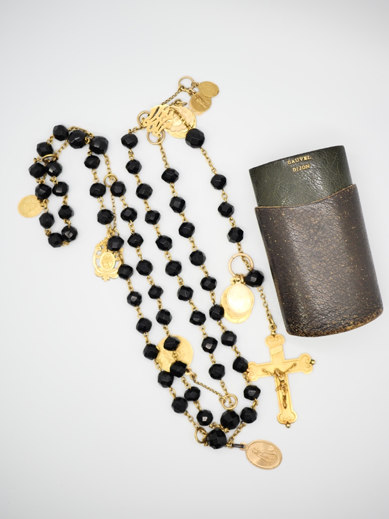 Très beau chapelet ancien en or 18k et perles de jais à facettes comprenant douze petites médailles religieuses et terminant par un Christ en croix de type "Cristo Vivo". Certaines médailles sont des souvenirs de Notre-Dame de la Garde, de Notre-Dame de Lourdes, de Notre-Dame de Fourvières, de la basilique de Lorette, de l'église Saint-Alphonse-de-Liguori de Rome. Certaines sont signées Ludovic Pénin à Lyon, d'autres sont monogrammées LC. Milieu du XIXème siècle. Poids total : 59,17 gr. Poids approximatif des éléments en or : 20 gr. Dans un étui en cuir
