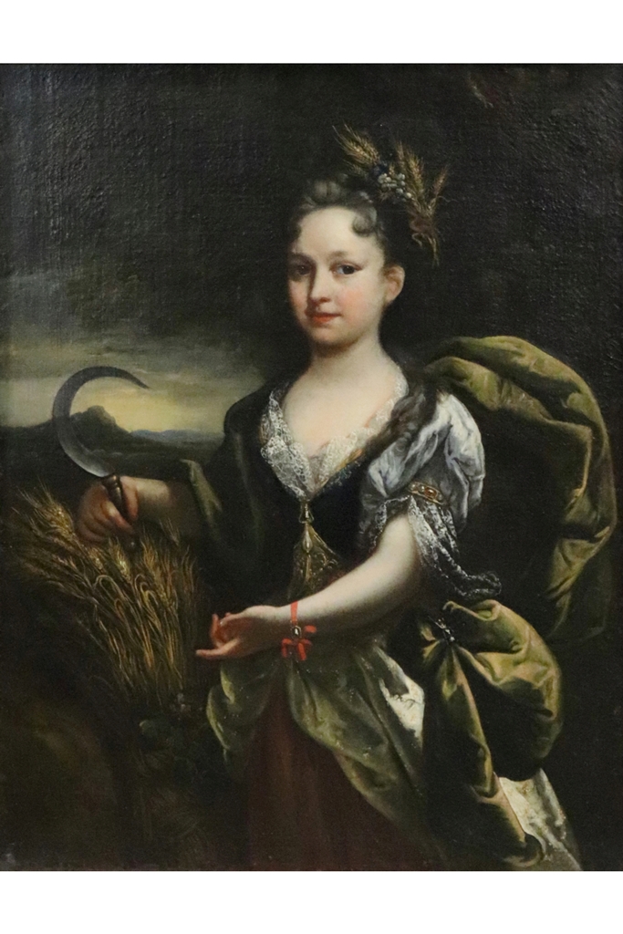 Ecole Italie du Nord vers 1690. Portrait de jeune femme en Cérès. Toile. Hauteur : 98,5 cm. Largeur : 74 cm. Cadre en bois sculpté doré. Travail français d'époque Louis XIV. Restaurations anciennes. Dimensions de l'encadrement : 112,5x88 cm - Expert : Stéphane Pinta du Cabinet Turquin