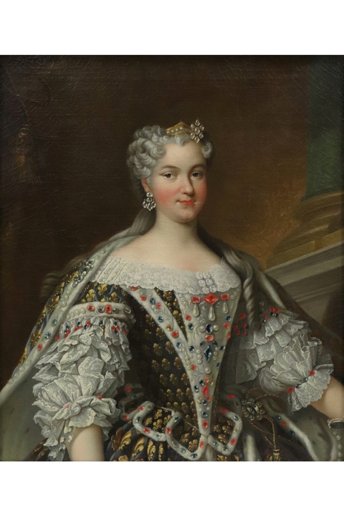 Ecole française du XVIIIème. Portrait de la reine Marie Leczinska. Toile. Hauteur : 84 cm. Largeur : 70,5 cm. Restaurations anciennes. Dimensions de l'encadrement : 97,5x83,5 cm - Expert : Stéphane Pinta du Cabinet Turquin