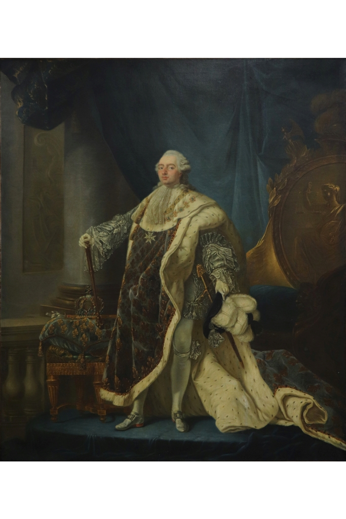 Ecole Française de la fin du XVIIIème suiveur de Antoine François Callet. Portrait de Louis XVI en costume de sacre. Toile. Hauteur : 181 cm. Largeur : 154 cm Dimensions de l'encadrement : 205x176 cm - Expert : Stéphane Pinta du Cabinet Turquin - Œuvres en rapport : Il existe de très nombreuses versions ou copies de ce portrait, en pied et de trois-quarts, dont l'original est peint par Antoine François Callet (1741-1823) . Parmi les plus célèbres, on peut citer : Portrait de Louis XVI en costume de sacre, toile, 246 x 192 cm, exposé sous le numéro 63 au salon de 1789 (Clermont-Ferrand, musée Bargoin). Portrait de Louis XVI en costume de sacre, toile, 278 x 196 cm, Versailles, musée National du château de Versailles et du Trianon, inv. 3111. Ce portrait a été gravé : Charles Clément Bervic, Louis XVI, roi des Français, restaurateur de la Liberté, gravure au burin, 1785. Johann Peter Pichler, Louis XVI, roi des Français, gravure à la manière noire, entre 1789-1791 Louis Jean Allais, Portrait en pied de Louis XVI en costume de sacre, gravure à la manière noire, 1791. En 1778, le comte de Vergennes, alors ministre des Affaires Etrangères, commande à Callet le portrait de Louis XVI, qui sert de modèle aux multiples portraits d'apparat, envoyés par la suite dans les différentes villes du royaume ou offerts aux grands personnages et aux ambassadeurs étrangers