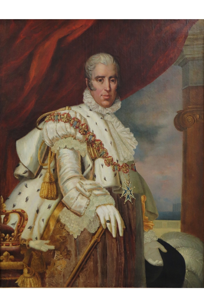 Ecole FRANCAISE vers 1830 suiveur du Baron GERARD. Portrait de Charles X en costume de sacre. Toile. Hauteur : 129 cm. Largeur : 98,5 cm. Restaurations anciennes. Dimensions de l'encadrement : 152x121 cm - Expert : Stéphane Pinta du Cabinet Turquin - Reprise partielle du portrait peint en 1825 par Gerard (Reims, musée de l'Œuvre - Palais du Tau)