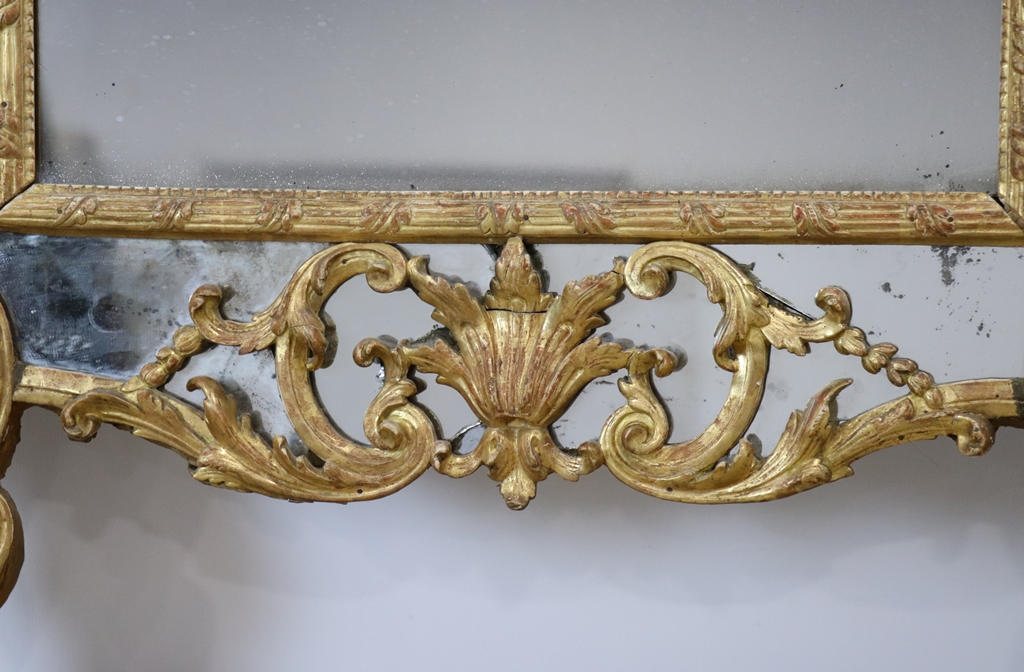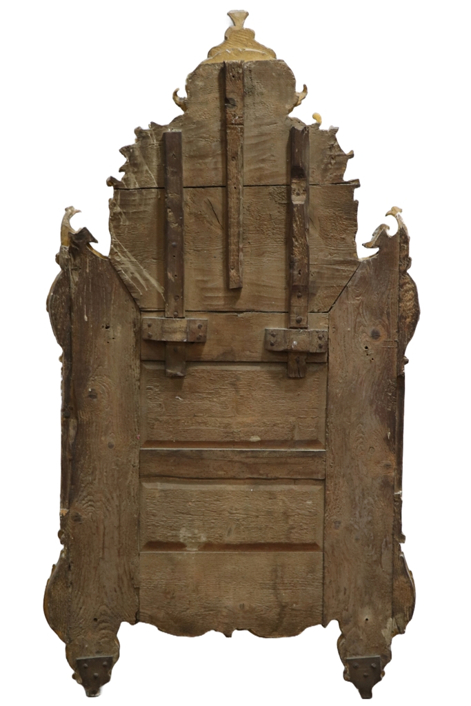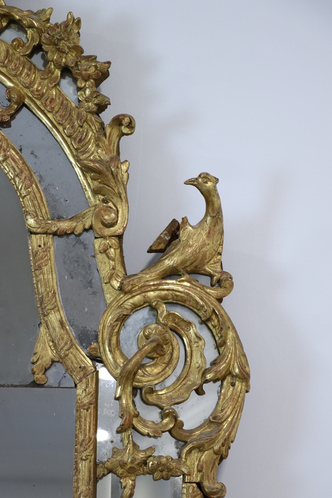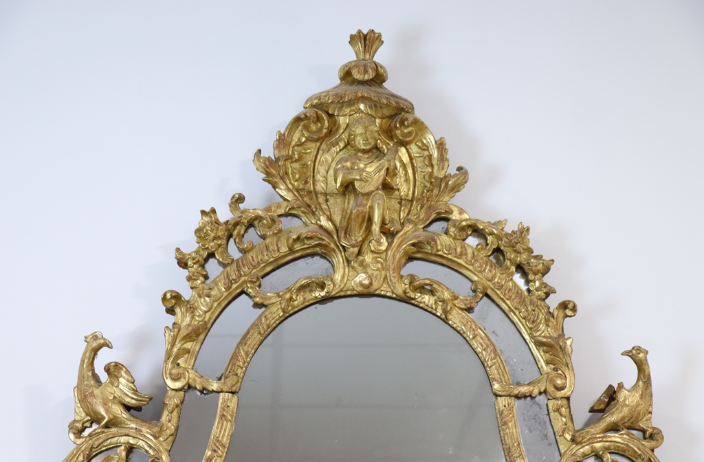 Important miroir à parecloses d'époque Régence dans un encadrement en bois sculpté et doré orné de volatiles. Fronton à décor d'un musicien sous un dais à panache. Restaurations d'usage et quelques manques. Dimensions : 177x98 cm