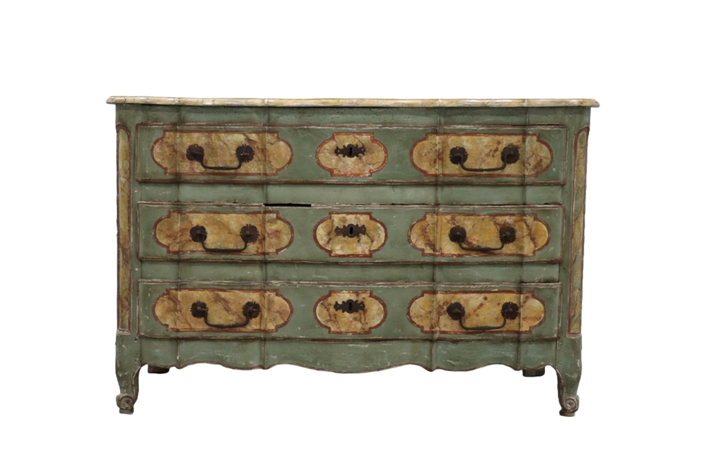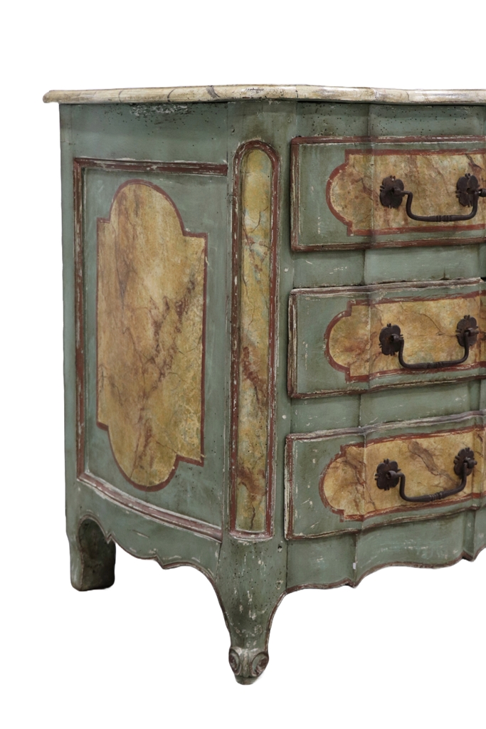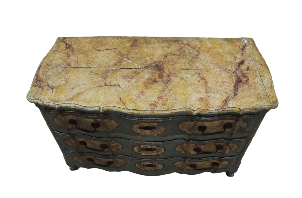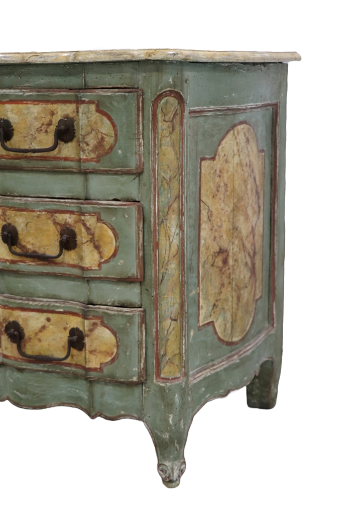 Commode en bois peint à façade en accolade et côtés légèrement galbés, ouvrant par trois tiroirs. Décor en faux marbre jaune de Sienne dans des réserves et sur le plateau. Une serrure d'origine sur le dernier tiroir, sans clef. Probablement Italie du XVIIIème siècle. Dimensions : 92x146x68 cm