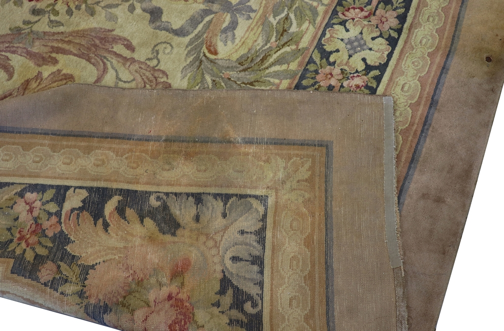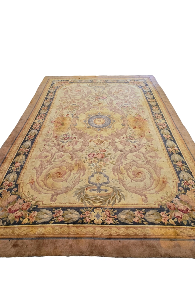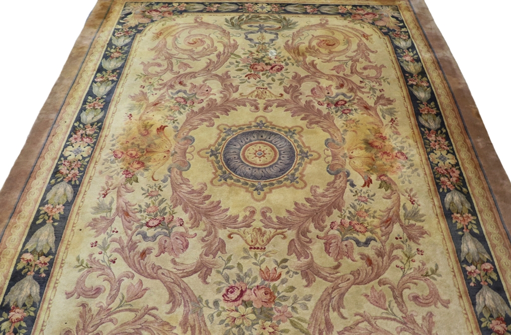 Tapis Savonnerie de style Napoléon III de la fin du XIXème siècle. Motif central rond sur fond beige orné de rinceaux feuillagés dans un encadrement de deux frises dont une à décor de fleurs sur fond sombre. Traces d'usures, taches et restaurations. Dimensions : 398x597 cm