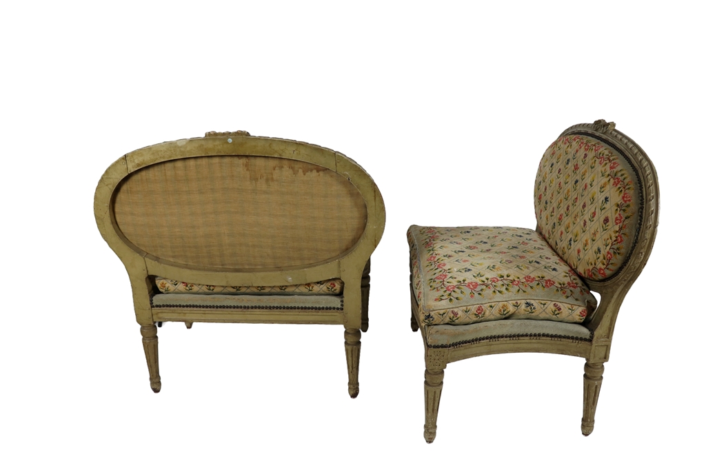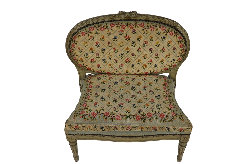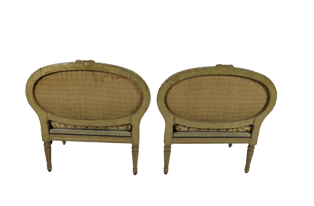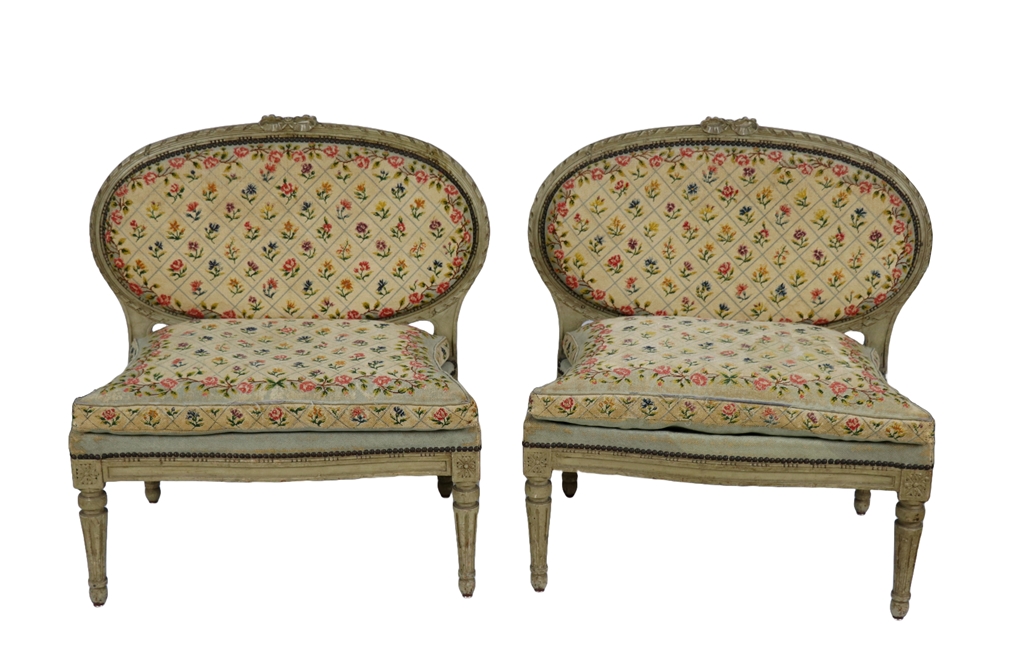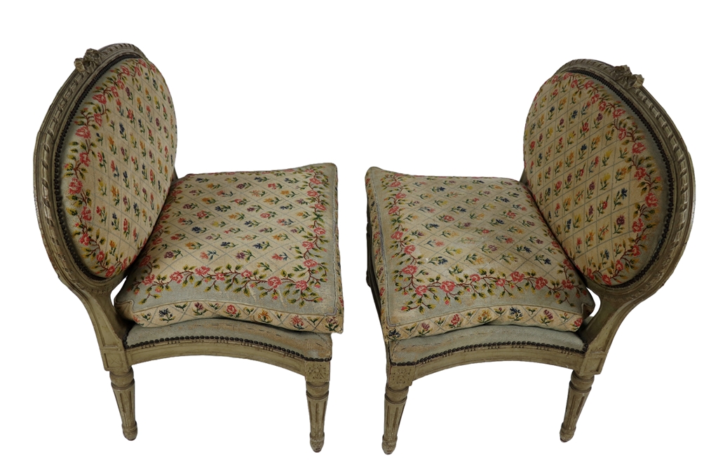 Paire de larges chaises basses en bois laqué de style Louis XVI à garniture de tapisserie au point de croix à décor de fleurettes dans un quadrillage. Usures d'usage. Dimensions : 80x89x53 cm