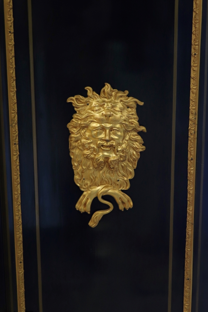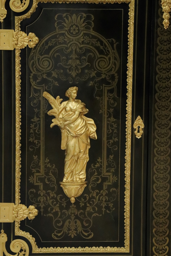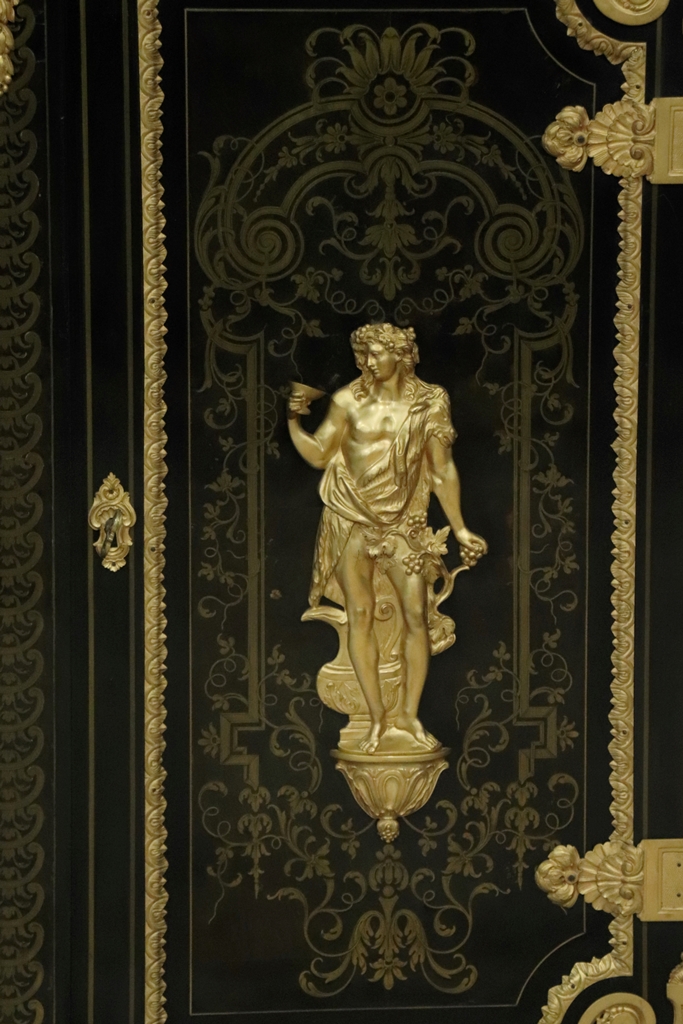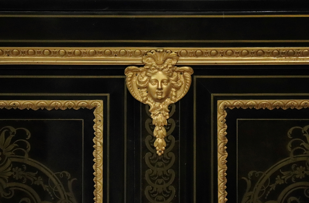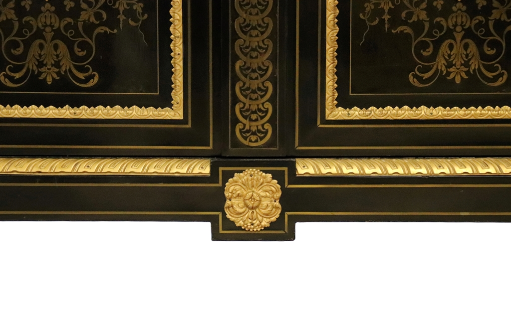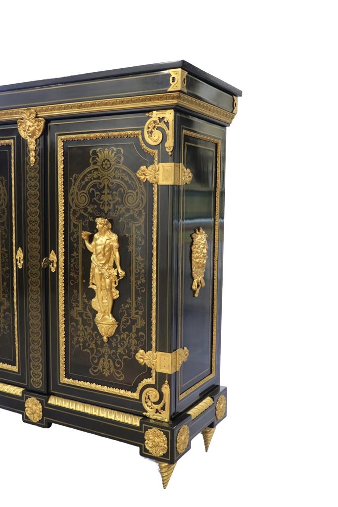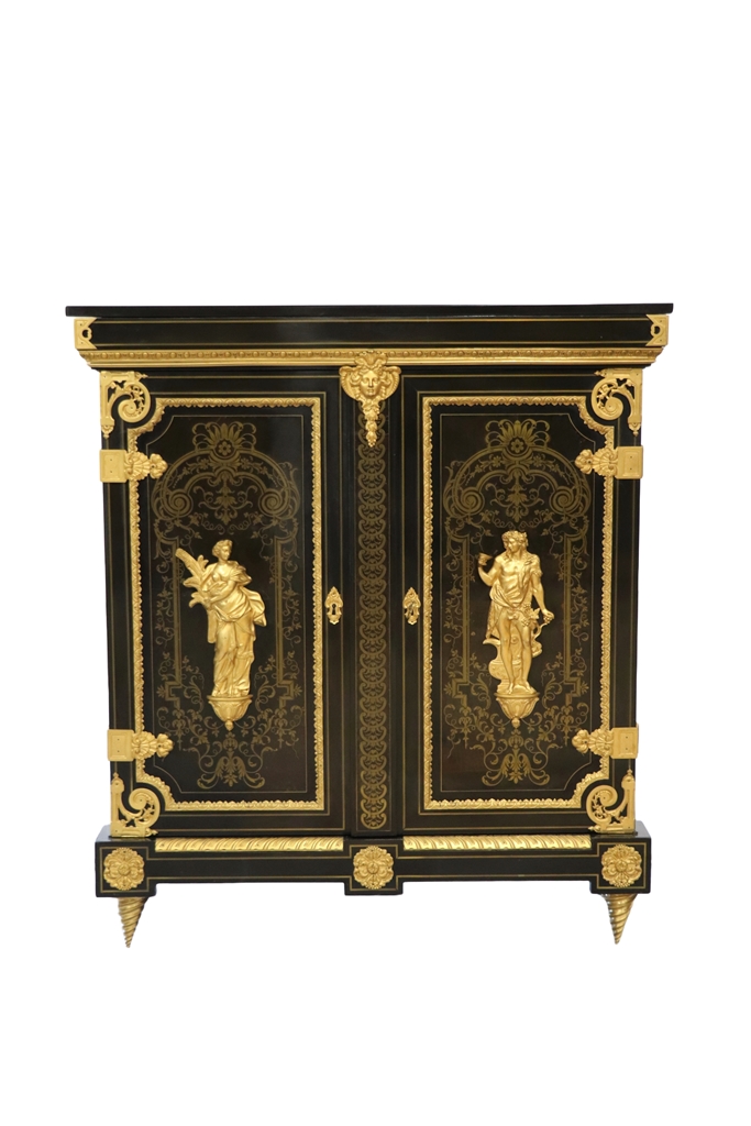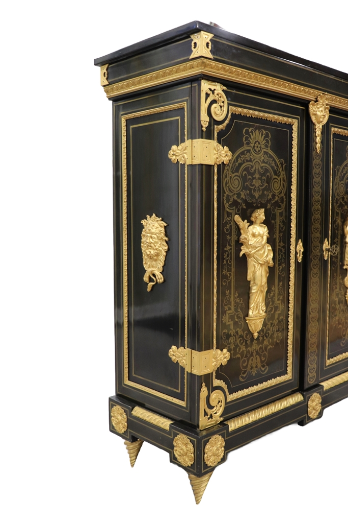 Maison SORMANI. Meuble d'appui ouvrant par deux portes à faux-dormant à décor marqueté de rinceaux dans des réserves soulignées par des frises en bronze doré, et au centre, par deux figures en bronze représentant Déméter et Dionysos. Riche ornementation de bronzes dorés comme les écoinçons, tête d'Hercule avec le lion de Némée, masques, charnières de porte. Plateau en marbre noir de Belgique. Mention sur la plaque de serrure : "Vve P. SORMANI & FILS 10, r. Charlot Paris". Epoque : Fin du XIXème siècle. Dimensions : 127,5x113,5x43 cm.