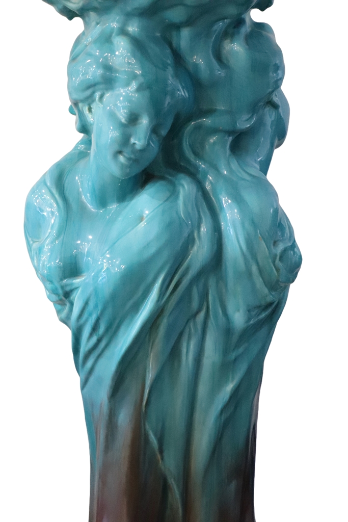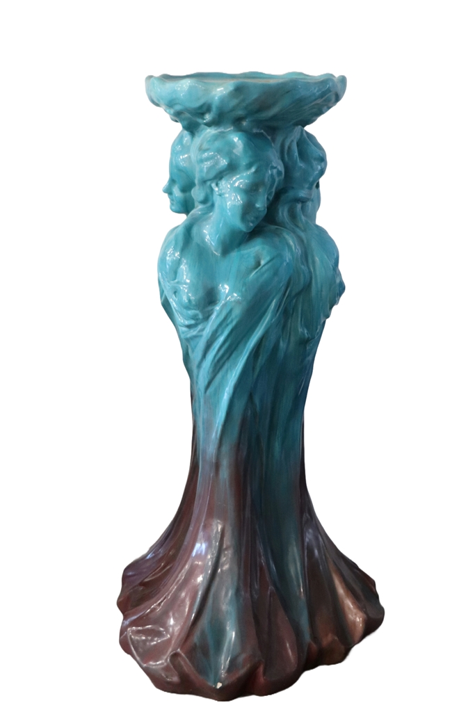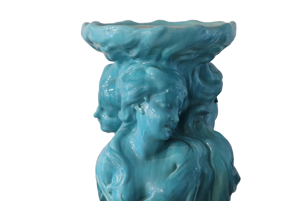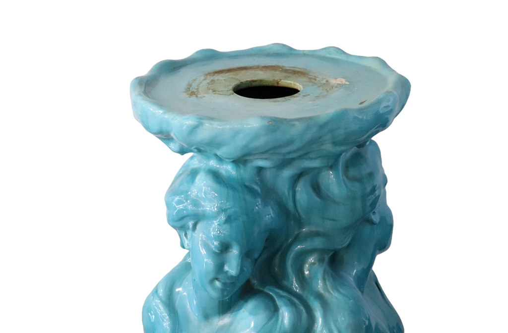 MASSIER à Vallauris (dans le goût de). Sellette en faïence émaillée bleu turquoise et brun présentant trois bustes de femmes souriantes. Hauteur : 129 cm