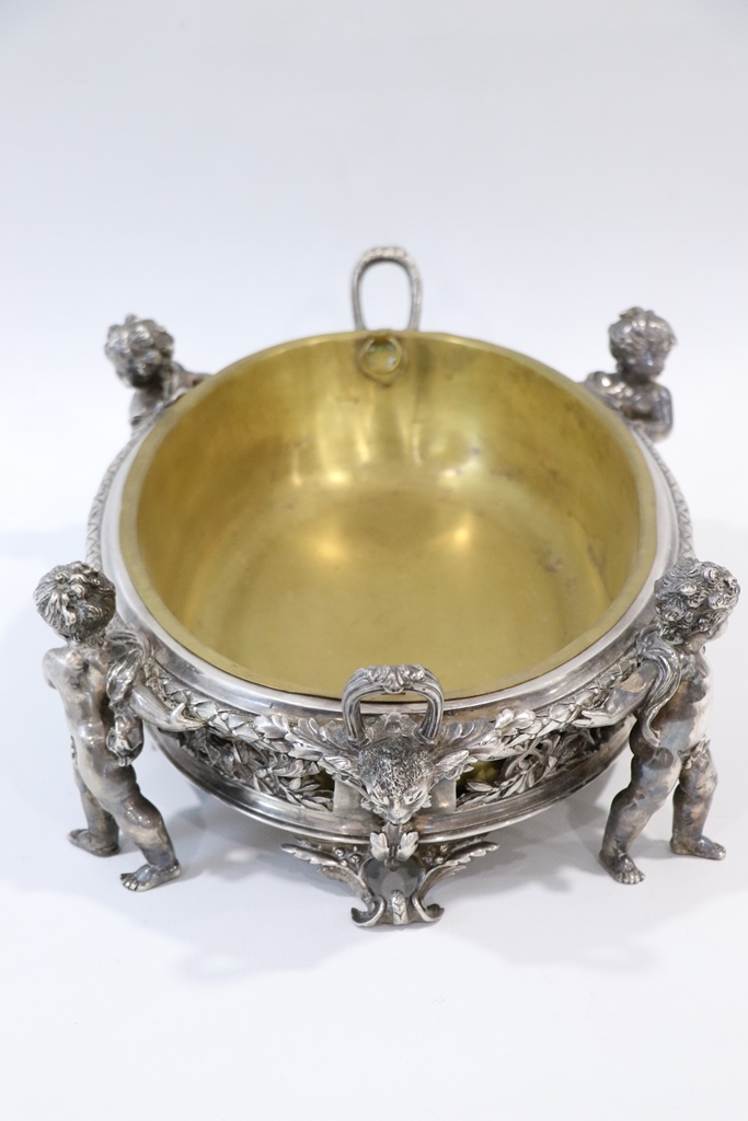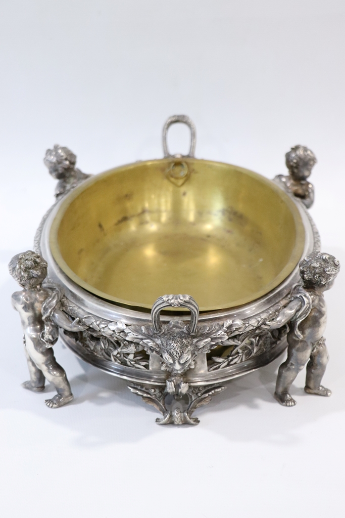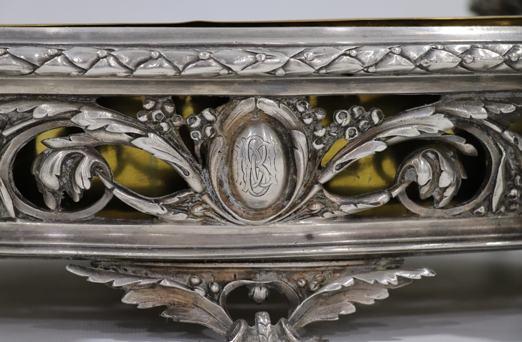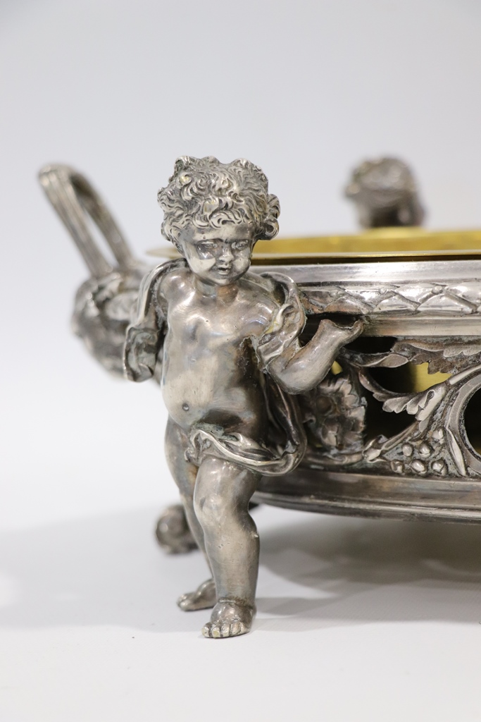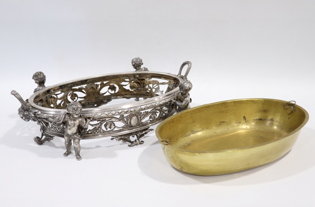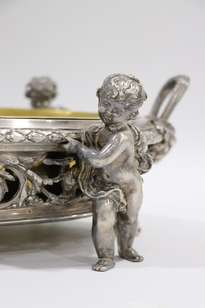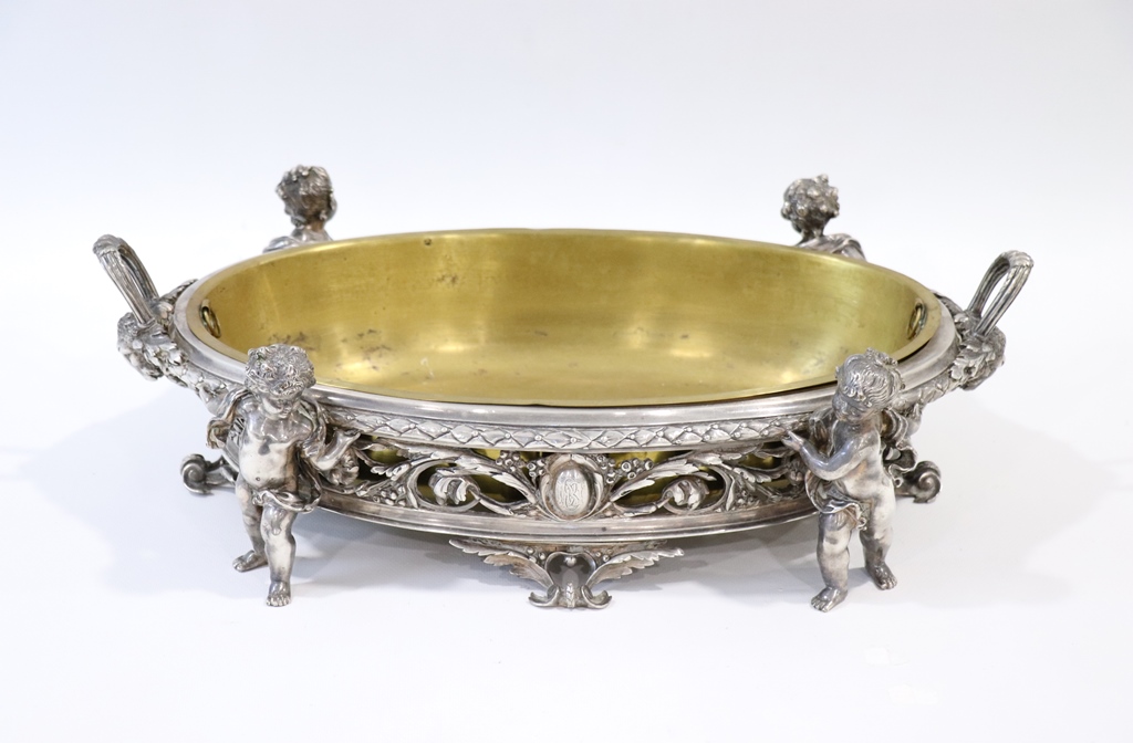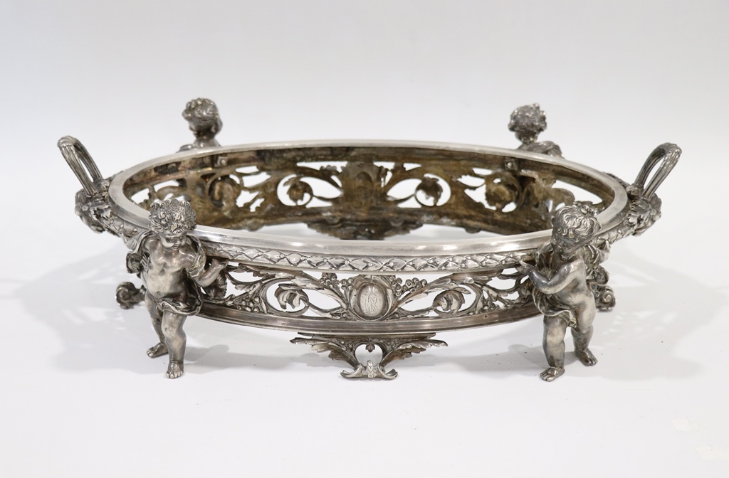 Surtout de table ajouré de rinceaux et de frises, en métal argenté, à décor de quatre enfants en ronde-bosse et à deux anses. Cuvette centrale en laiton. Dimensions : 15,5x50x32 cm