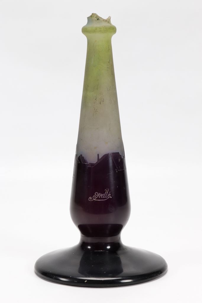 Etablissements Gallé. Lampe champignon en l’état comprenant un pied de lampe bagué signé à décor gravé d’une ville au col accidenté et un chapeau de lampe signé à décor gravé de deux cigognes. Sans son système de fixation. Hauteur du pied : 27 cm. Diamètre du chapeau : 27 cm – Estimations : 1200/1500 €