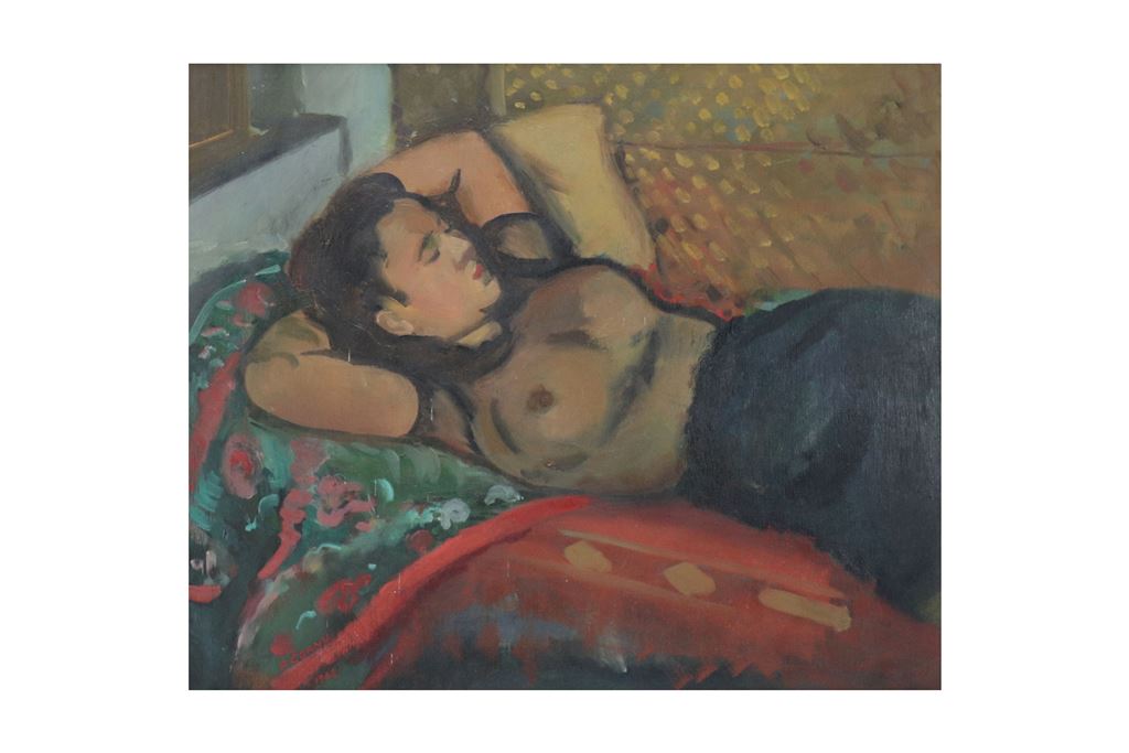 Pierre CORNU (1895-1996). Femme sur son lit. Huile sur panneau signée en bas à gauche datée 1942. Dimensions : 46×54,5 cm – Estimations : 300/500 €