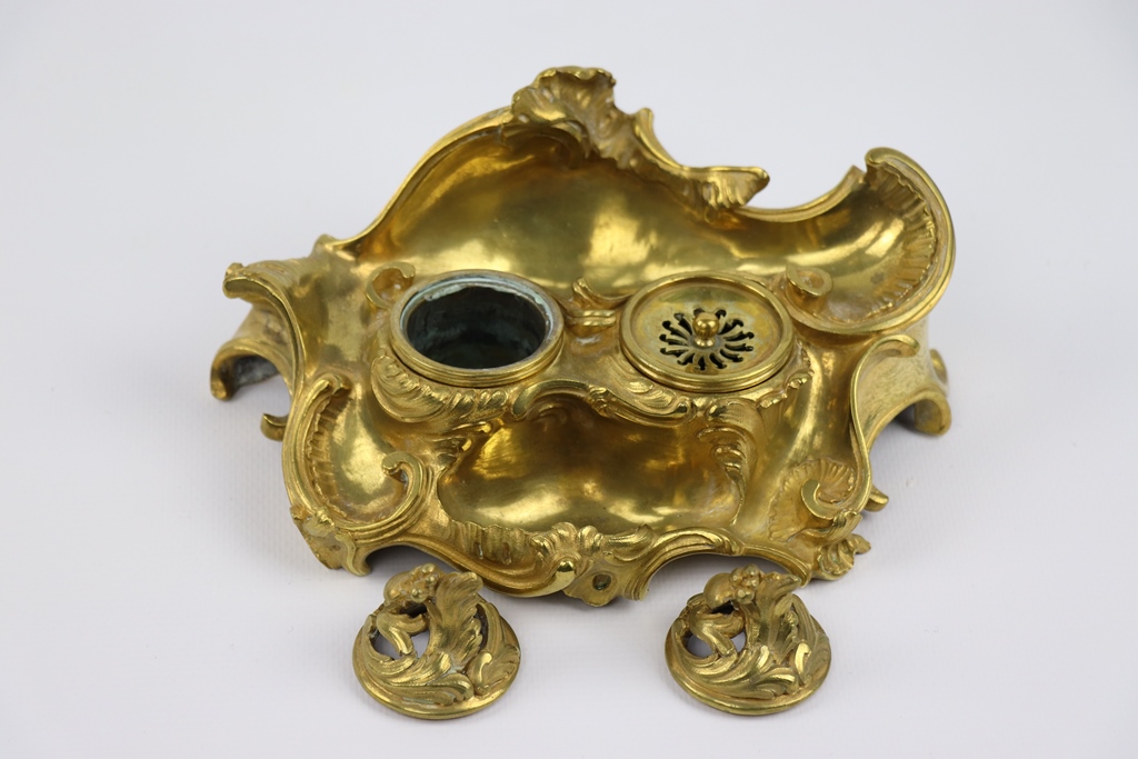 Encrier en bronze de style rocaille d'époque XIXème. Dimensions : 8,5x19x13 cm
