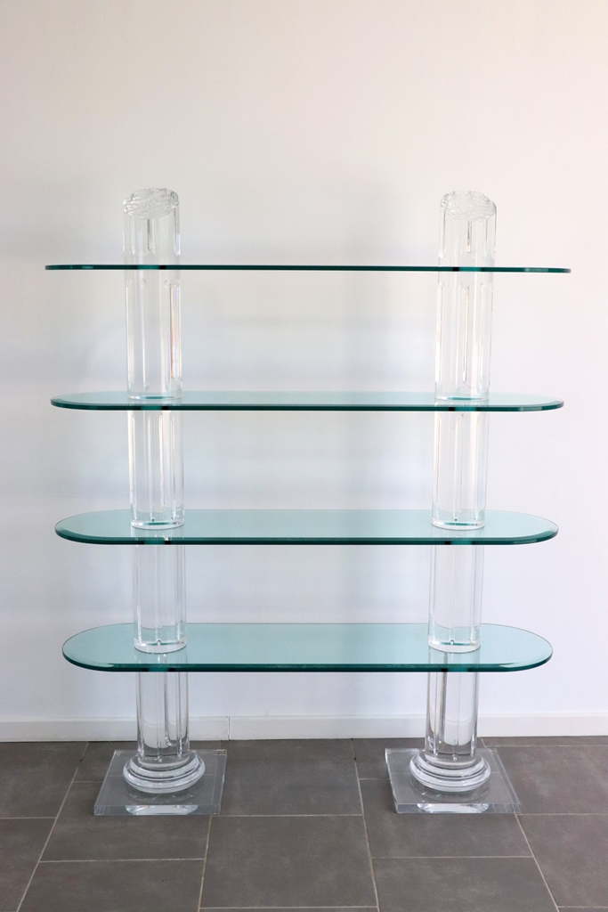 Etagère en méthacrylate et verre. Plateaux en verre biseauté (égrenures). Montants formés de colonnes cannelées. Dimensions : 183x150x39,5 cm. Provenant probablement de la Maison Roméo à Paris