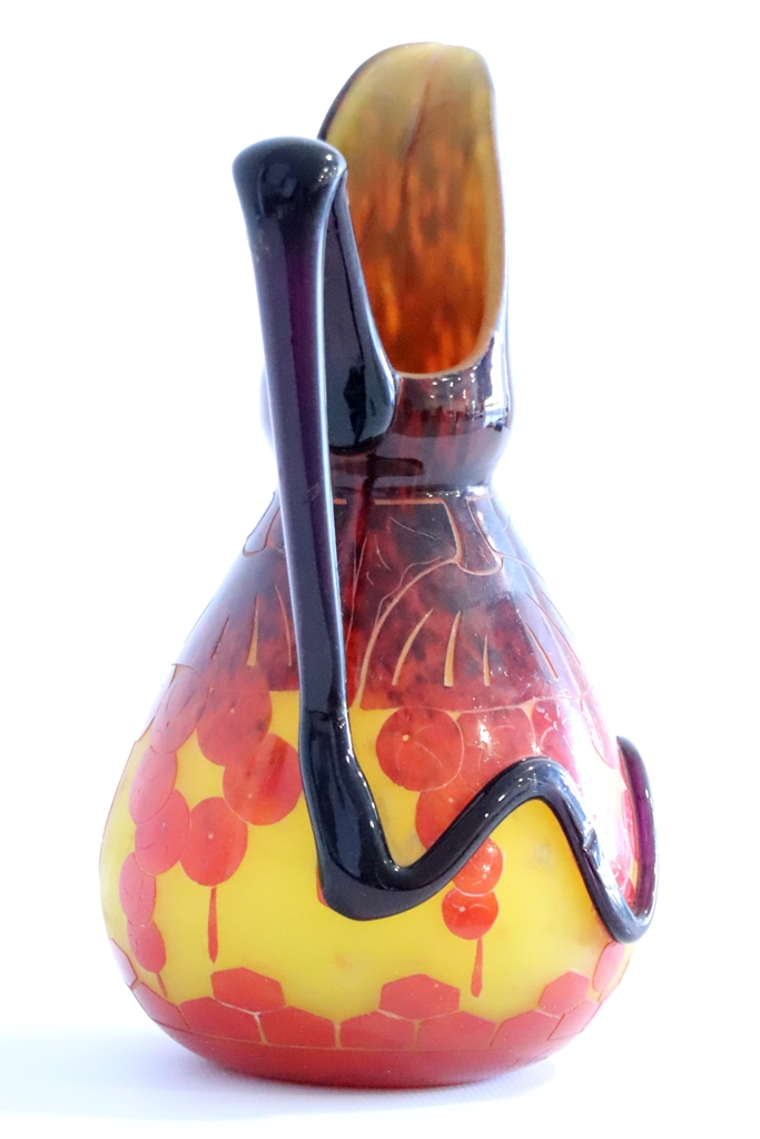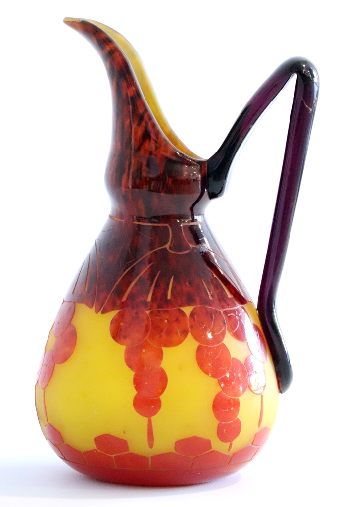 LE VERRE FRANCAIS. Pichet à anse appliquée en verre multicouche à décor dégagé à l'acide sur fond jaune. Signé Le Verre Français. Petit manque à la queue de l'anse. Hauteur : 31,5 cm