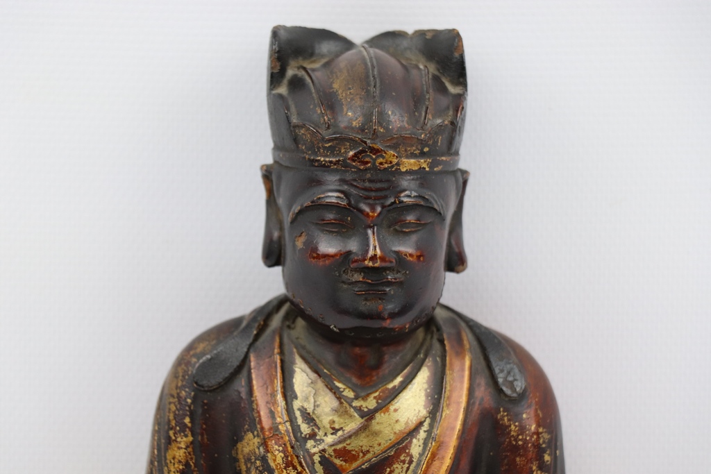 Sujet en bois laqué or sur fond brun-rouge représentant un dieu du Tao assis, une main tenant sa manche. Chine, XIXe siècle. (Lacunes de laque, usures, petits manques). Hauteur : 29 cm Expert : Anne Papillon