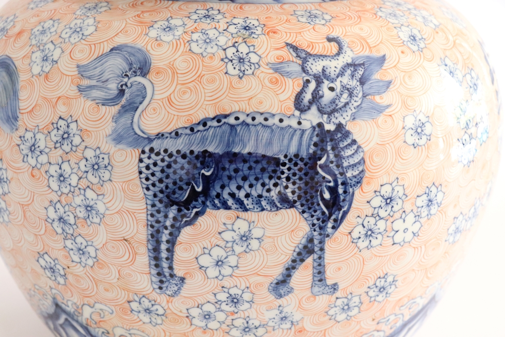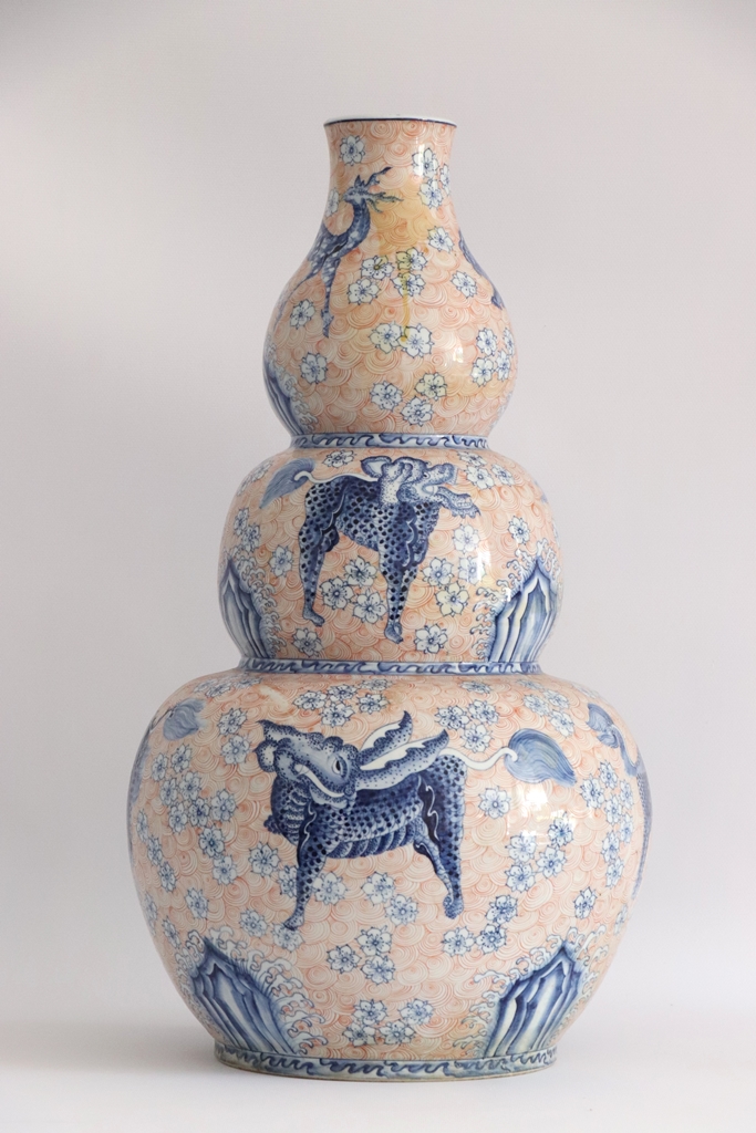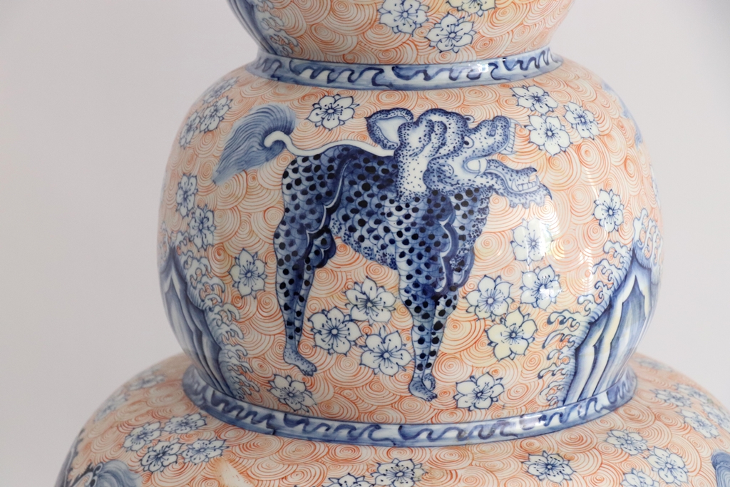 Important vase en porcelaine à trois panses croissantes à décor d'animaux et de fleurs bleues sur fond de nuées rouges (taches). Hauteur : 68 cm