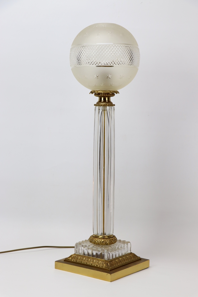 Lampe à poser à fût et socle en verre à monture en laiton, avec un globe. Hauteur : 66 cm - Estimations : 150/200 €