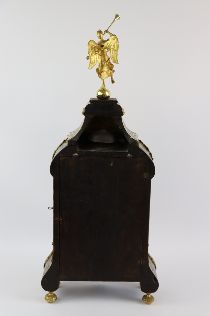 Cartel en placage d'écaille brune et laiton à décor de volutes, de rinceaux et d'un damier intérieur. Le cadran à chiffres émaillés sur fond de laiton estampé et ciselé et le mouvement signé de Dumont Frères à Besançon. Il présente une décoration de bronzes tels que des feuilles d'acanthe un masque sur la porte de façade. Surmonté d'une renommée en bronze. Style Louis XIV d'époque du XIXème siècle. Vitres postérieures. Dimensions : 84x36x13 cm - Estimations : 1600/2000 €
