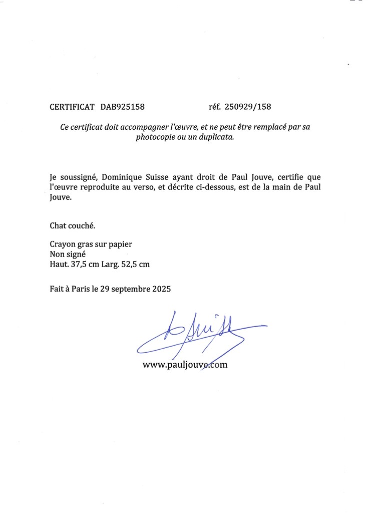 Paul JOUVE (1878-1973). Chat. Crayon gras sur papier. Dimensions : 37,5x52,5 cm. Certificat de Dominique SUISSE en date du 29 septembre 2025