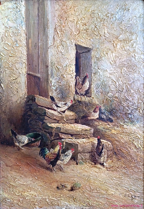 Lot 62 - Ecole Française XIXème. « Les Poules », huile sur panneau signée en bas à droite. 32,5x22,5 cm - Estimations : 40/60 €