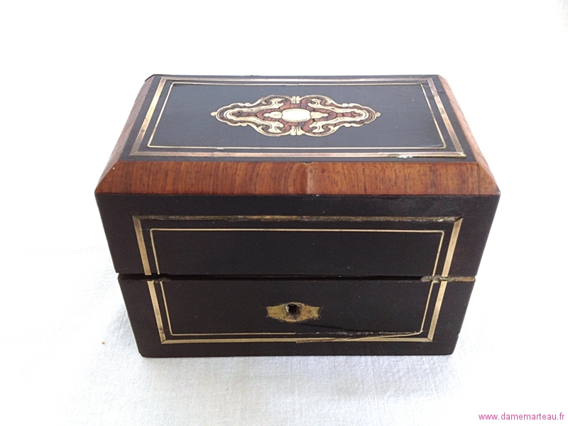 Lot 72 - Coffret Napoléon III en bois noirci et placage à décor d'un médaillon en laiton découvrant deux flacons en verre bleu à décor doré. 10x13,5x8 cm - Estimations : 120/150 €
