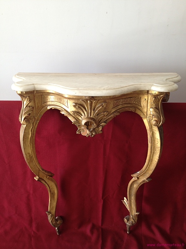 Lot 160 - Console d'applique en bois et stuc doré de style Louis XV à décor de feuilles d'acanthe reposant sur deux pieds cambrés (manques). Plateau de marbre blanc. 91x77x33 cm - Estimations : 300/400 €