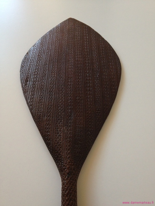 Lot 85 - Pagaie cérémonielle des Iles Australes en bois sculpté sur toute sa surface de motifs géométriques. Au sommet à décor de huit têtes stylisées aux yeux exorbités. Epoque XIXème. Longueur : 116 cm - Estimations : 2500/3000 €