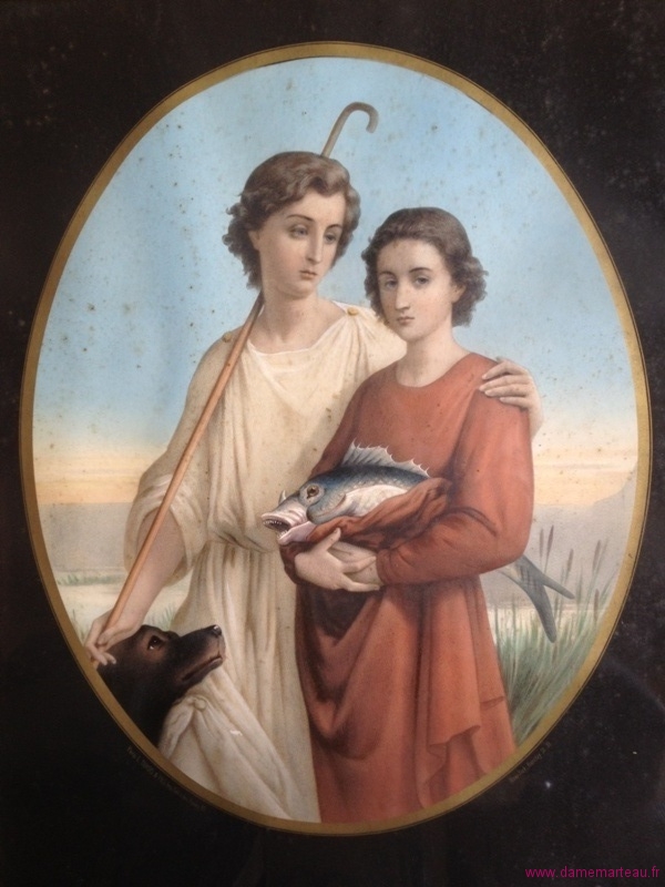 Lot 87 - Paire de chromolithographies religieuses à vue ovale dans des encadrements dorés. Dimensions totales : 80x65 cm - Estimations : 80/100 €