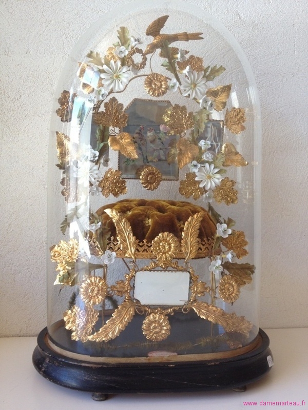 Lot 163 - Globe de mariage à décor d'oiseaux et de feuillages orné d'un présentoir en velours et de deux petits miroirs. Hauteur : 50 cm - Estimations : 150/180 €