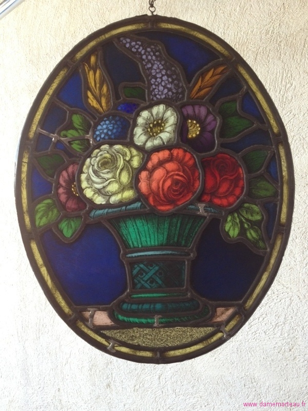 Lot 179 - Paire de vitraux ovales à décor de bouquets fleuris (accident). Epoque XIXème. 40x32 cm - Estimations : 150/200 €
