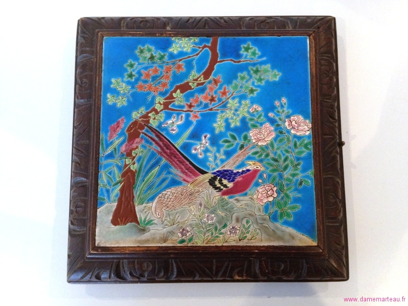 Lot 32 - LONGWY. Dessous de plat musical à deux airs orné d'une plaque en émaux à décor de deux volatiles. Dimensions : 7x28x28 cm - Estimations : 40/50 €
