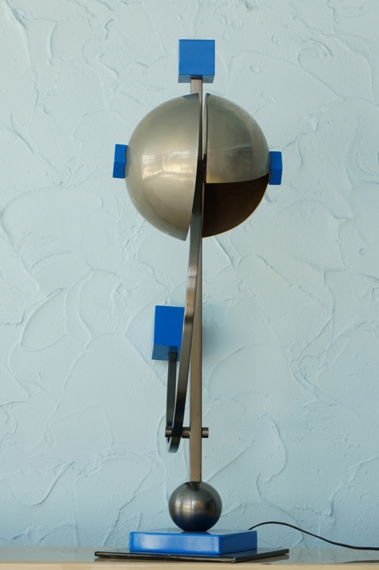 Lot N° 13 - Serge MANZON (1930-1998) pour Pierre CARDIN. Lampe Balance. Structure tubulaire en métal brossé, embouts cubiques bleus, deux coupelles en métal nickelé, éclairant par deux ampoules. (petits accidents sur le socle). Dimensions : 85x60x25 cm - Estimations : 25000 / 30000 €