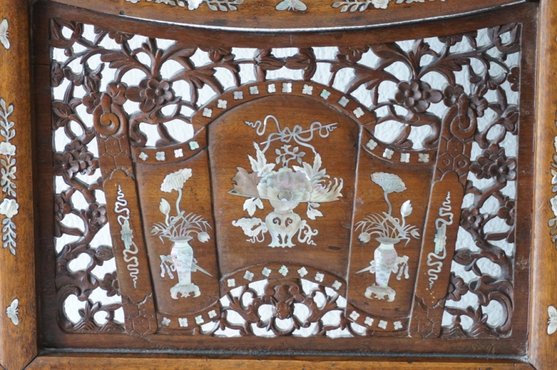 Lot N° 92 - Extrême-Orient. Ecran de lettré en bois ajouré et sculpté à décor d'incrustations de nacre représentant des personnages dans des demeures sur fond de paysage. Epoque : Fin XIXème-Début XXème. Dim. : 82x84x26 cm - Estimations : 200/300 €